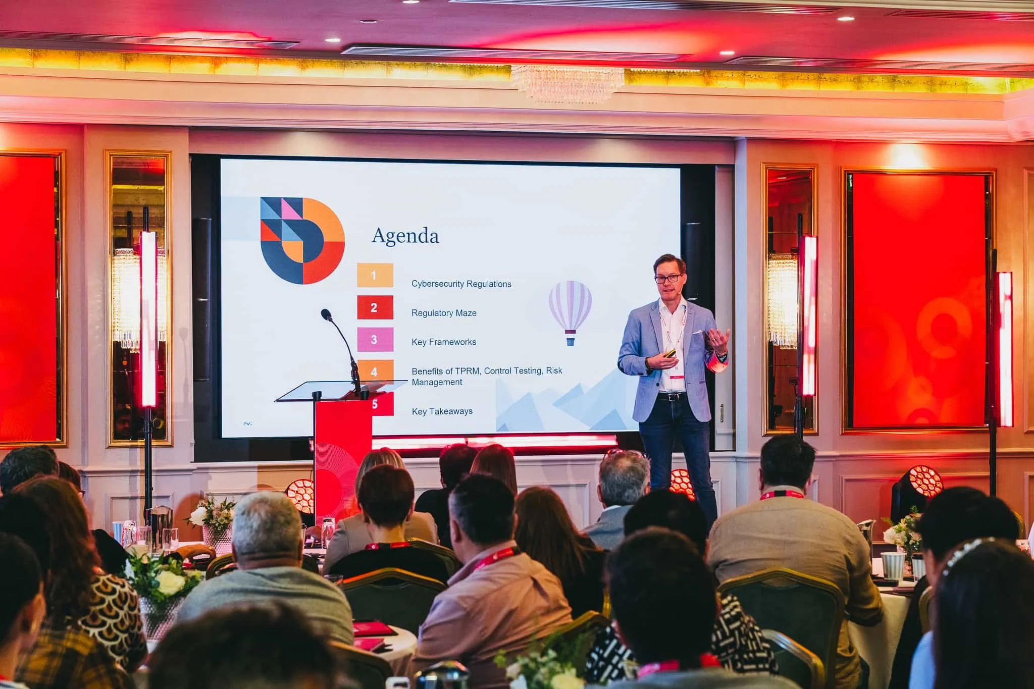 We built a clean stage setup using Revostage lightweight staging decks and a glass lectern , creating a strong focal point for speakers.