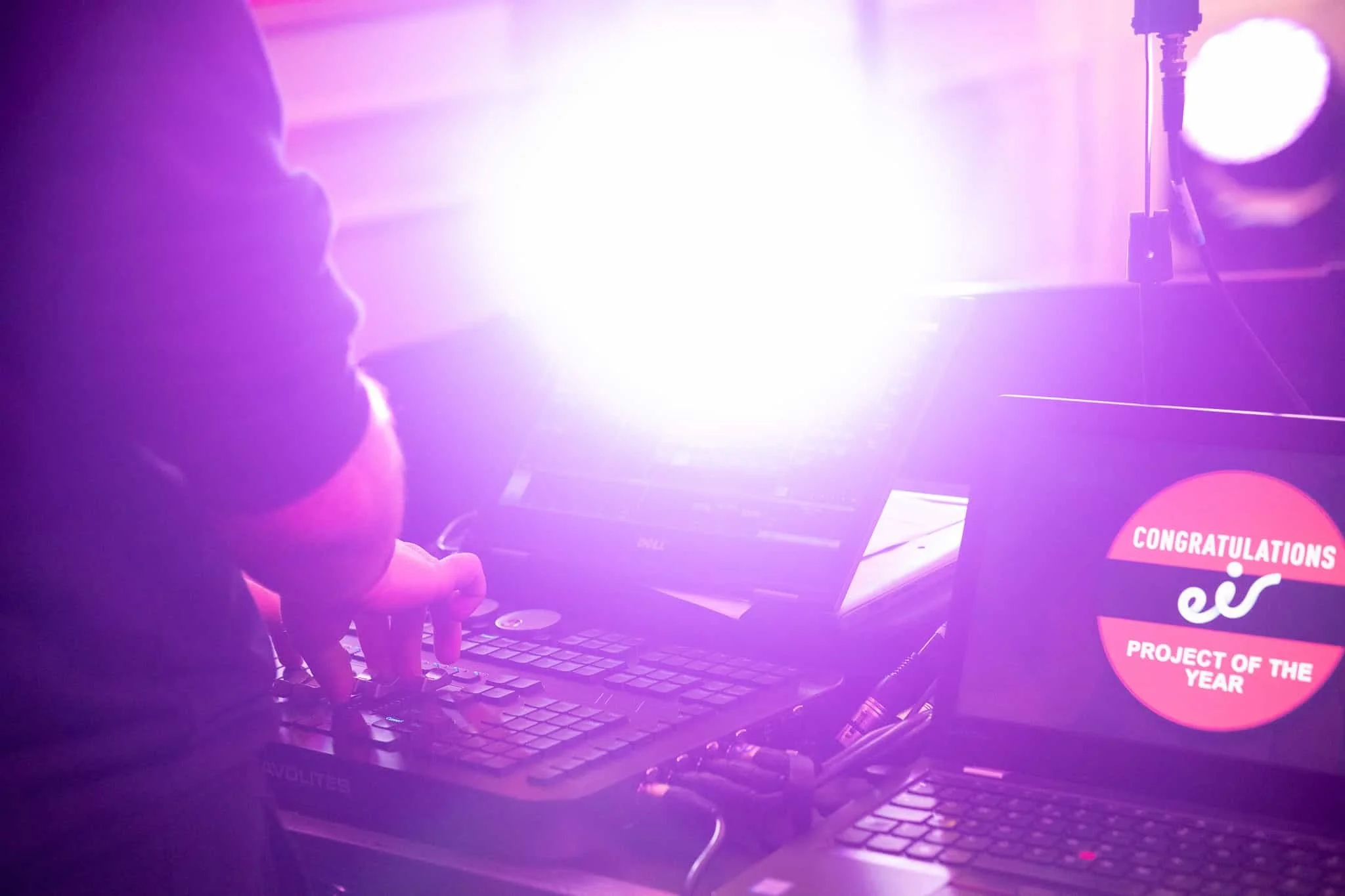 We installed a full lighting package including LED PAR uplighting, battery LED tubes, profile fixtures, and moving head lighting, all controlled via an Avolites desk. This allowed us to adjust the look of the room throughout the day, from presentations to more informal networking moments.
