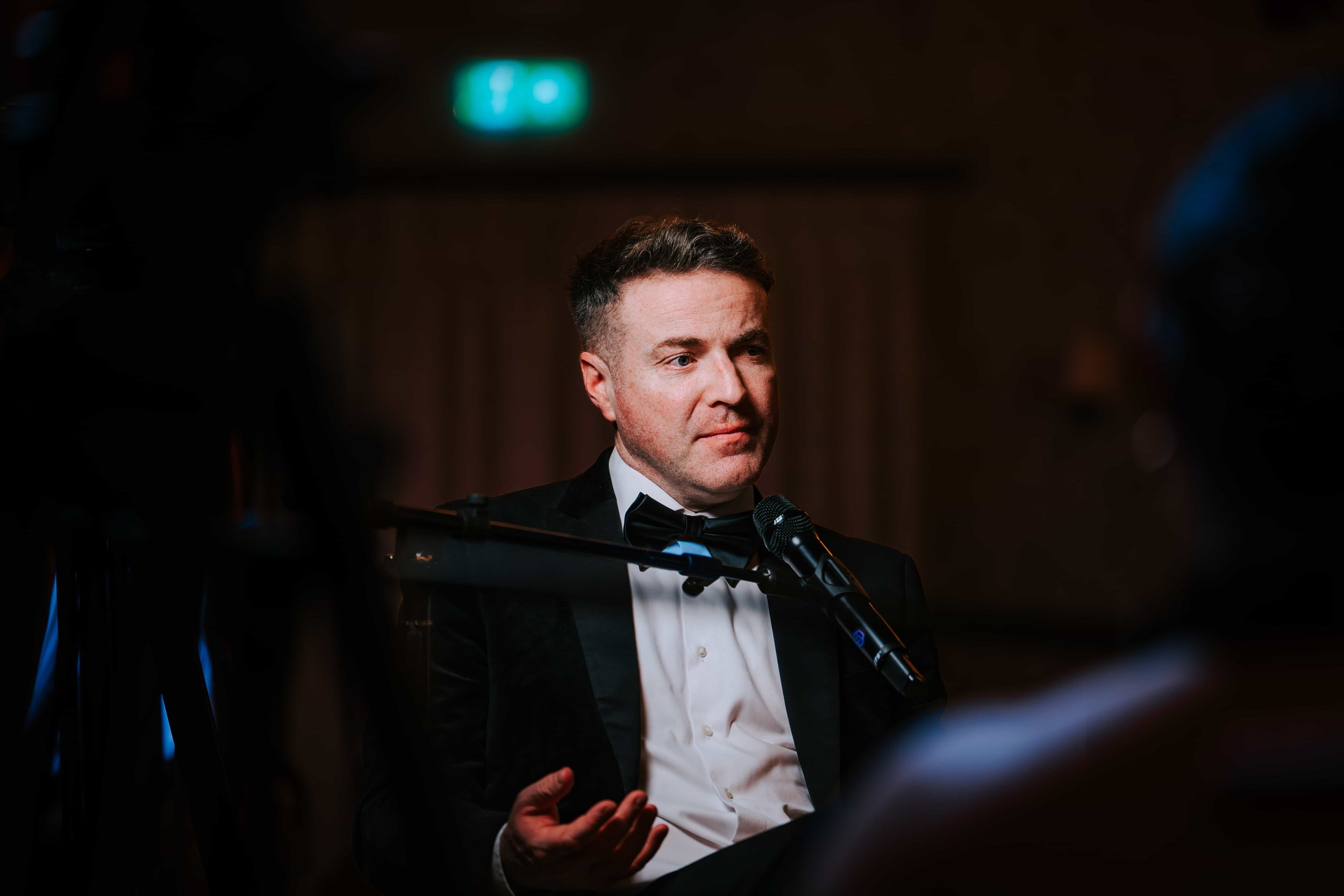 Lighting played a big role in setting the tone. We supplied a comprehensive lighting package including LED PAR uplighters, moving heads, LED bars, and profile fixtures, all controlled from an Avolites console. This allowed us to move easily between formal dinner lighting, podcast focus, and more dynamic looks as the night progressed .